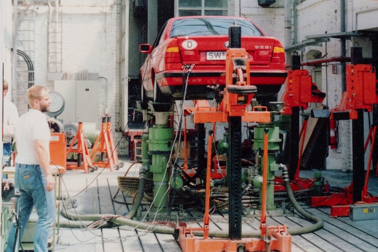 Vertikal-Vermessung des CDC-Entwicklungsfahrzeugs auf der 4-Stempel-Anlage bei der RWTH Aachen (1991)