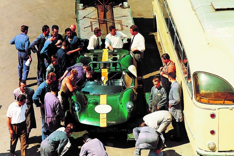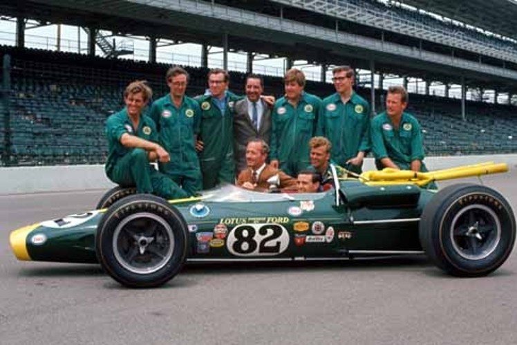 The happy Lotus team after the 1965 Indianapolis 500-mile race with Jim Clark at the wheel and Colin Chapman behind.