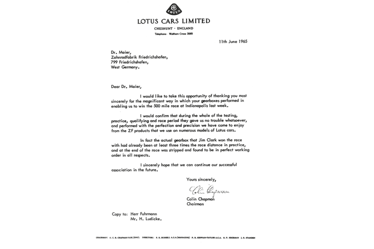 The DS transmissions have been continuously developed in consultation with Colin Chapman: The 5 DS10 was expanded as the 5 DS12 (120 Nm) and most recently as the 5 DS20. Jim Clark won the legendary Indianapolis 500-mile race in 1965 with the Type 38 and a ZF 5 DS 20, in which the Newton meter figure had already been increased to 200. Jim Clark and Colin Chapman, in gentlemanly fashion, immediately thanked ZF by telegram afterwards, both congratulating ZF on the victory and expressing their enthusiasm for the constructors' achievement. A great gesture, which on the one hand certainly paid tribute to the high engineering skills of the ZF technicians - but on the other hand also reflected the congenial, charming manner of the congratulators and their close, trusting relationship with the designers at Lake Constance.