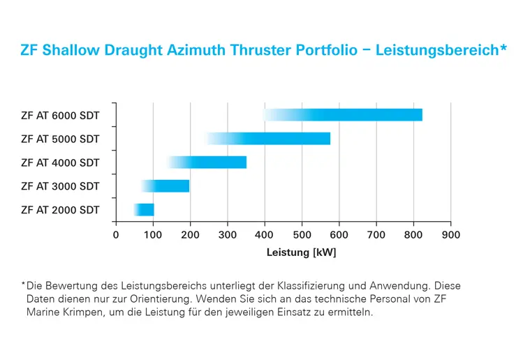 Der ZF Shallow Draught Ruderpropeller ist die perfekte Lösung für Schiffe, die in flachen Gewässern navigieren. Er wird typischerweise in Pontons, Landungsbooten, Fähren und Arbeitsschiffen als Hauptantrieb oder auch als Nebenantrieb eingesetzt. Lieferbar ist der Ruderpropeller in einem Leistungsbereich von 50-825 kW.