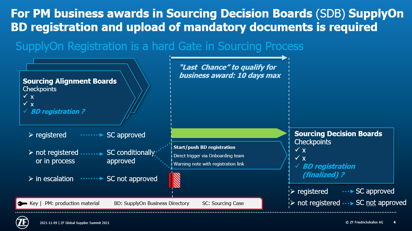 Für Lieferanten von Produktionsmaterial ist die Registrierung im Business Directory besonders relevant. Der Beschaffungsprozess für Produktionsmaterial erlaubt die Vergabe von Aufträgen nur, wenn der Lieferant im Business Directory registriert ist und die erforderlichen Informationen bereitstellt. Diese Botschaft wurde auf dem Global Supplier Summit 2021 wie folgt kommuniziert: