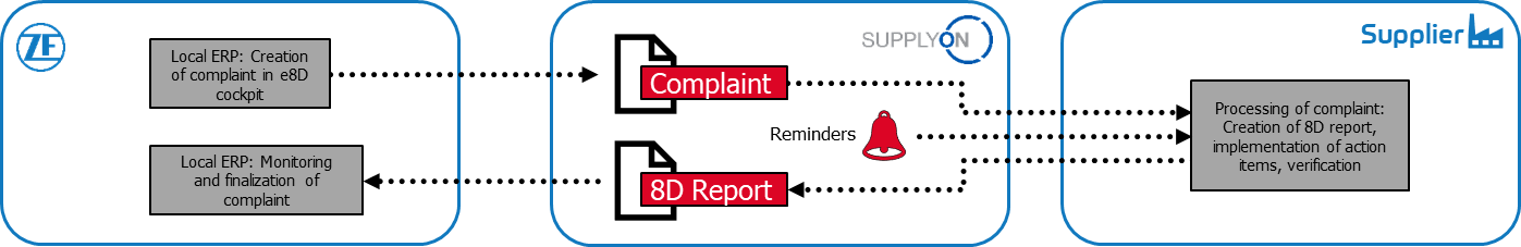 Um Reklamationen an Lieferanten schnell und transparent zu bearbeiten nutzt ZF das SupplyOn Modul Problem Solver (auch e-8D genannt). Probleme und Fehler können mit der 8D-Methode gemeinsam analysiert und Lösungen gefunden werden, um die Wiederholung von Fehlern zu vermeiden.
